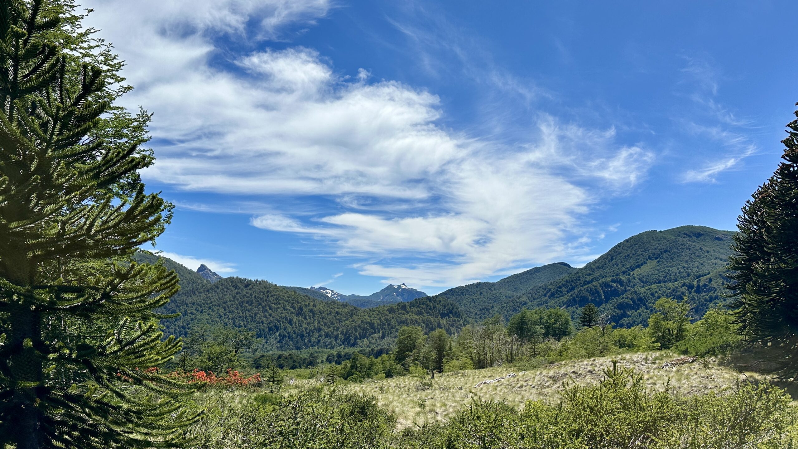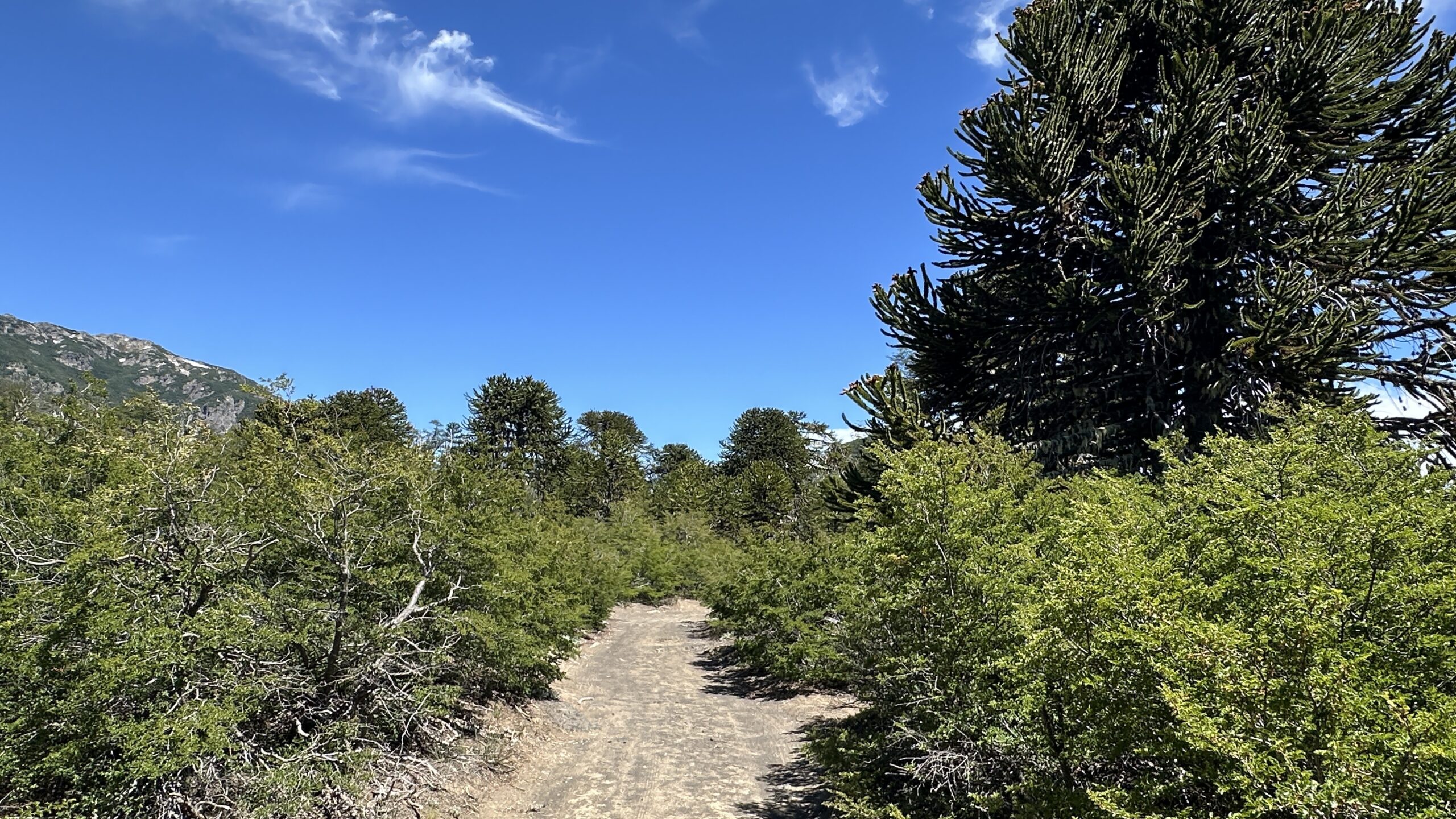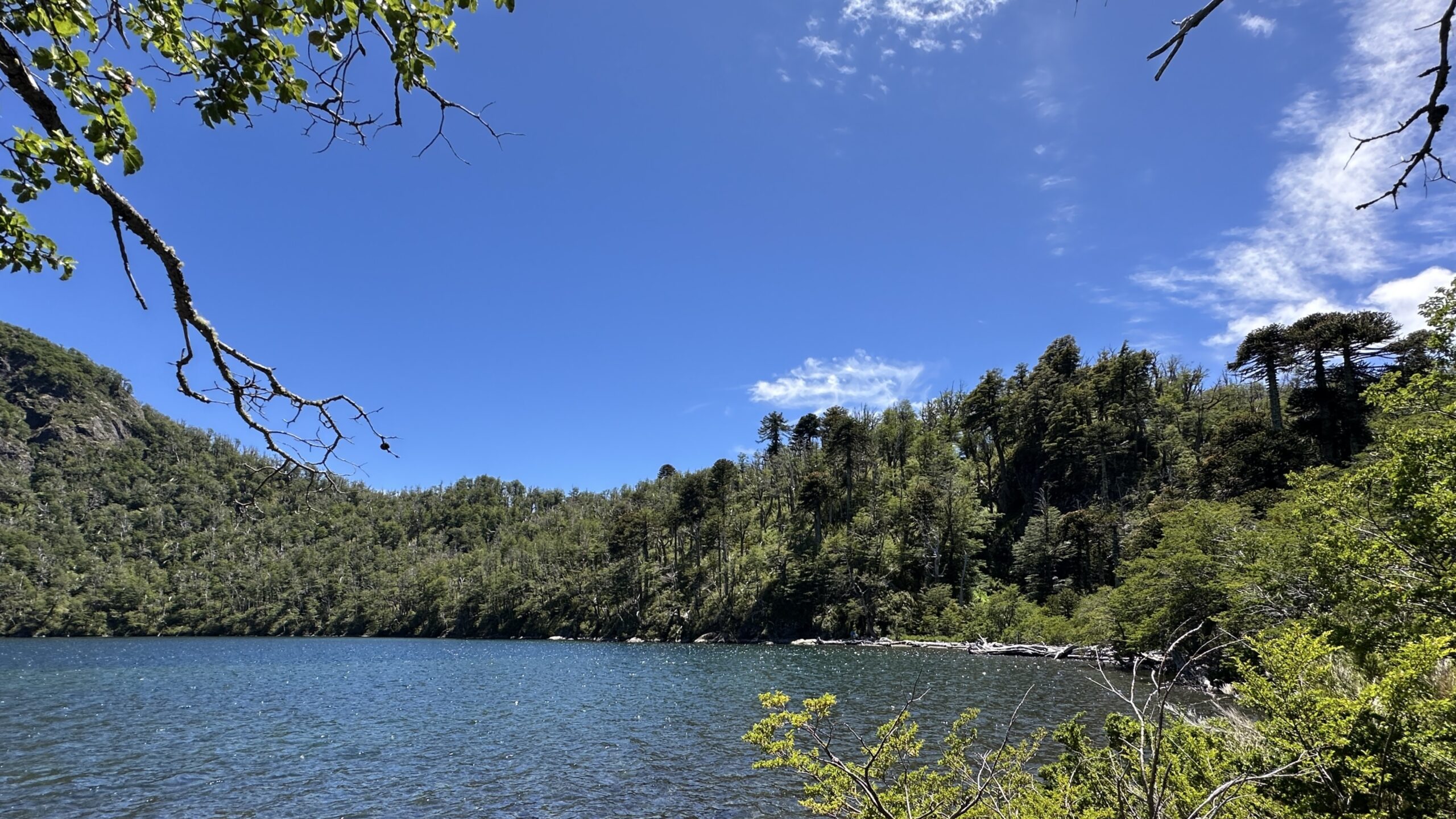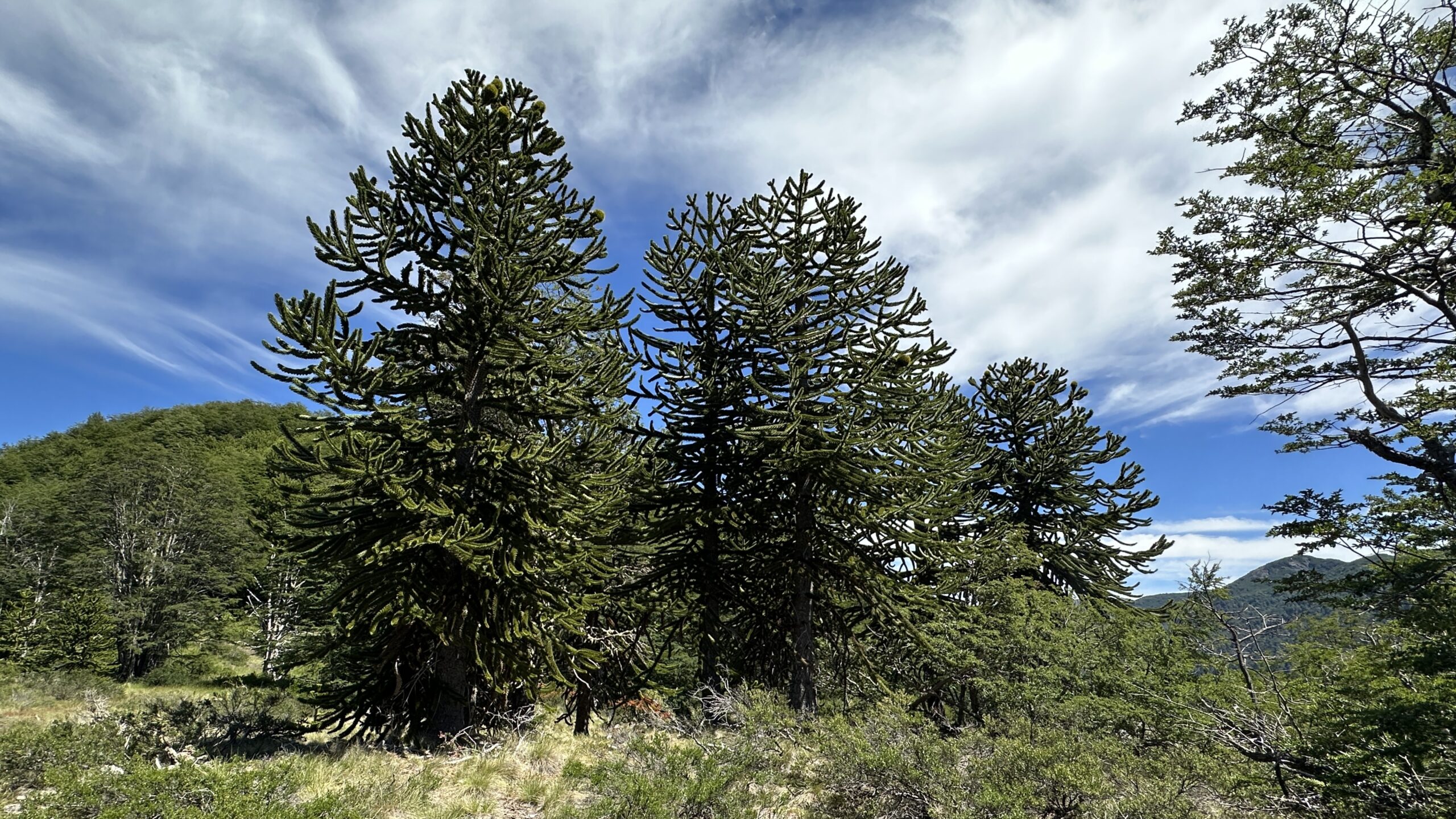 Die kleine Zufahrt zu dem Platz an dem wir eventuell eine Nacht verbringen wollen, ist sehr holperig. Schwankend kommen wir am Platz an. Schuhe an und ab zu der Lagune Huinfiuca. Der Weg führt uns durch verschiedene Vegetationen. Die chilenischen Araukarie fanden wir Beide sehr beeindruckend und haben diesen Baum gründlich erforscht. Wenn es soviele Samenkappseln gibt, warum wachsen hier nur vereinzelte Araularie? 5 Minuten später sehen wir in einem Wald von Araukarien. Die Rinden von den alten Bäumen sind wunderschön und anders als die Rinden, die ich kenne.