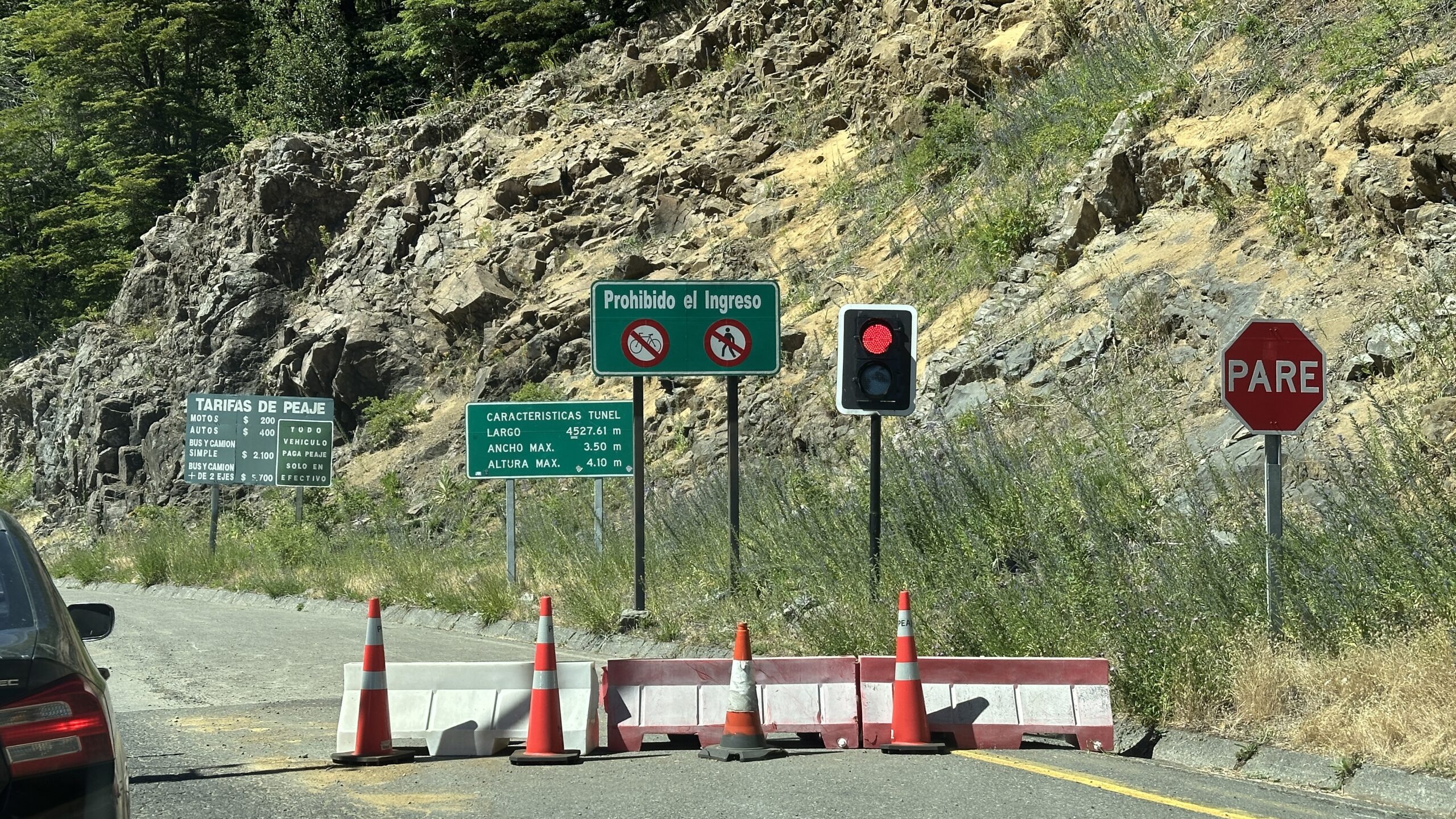 Über den Pass Pino Hachado (1.885 hm) fahren wir zu dem Tunnel „Salida Tunel de las raíces“ fahren. Ein einspuriger Tunnel, Maut ist in bar zu bezahlen. Aber wo? Einmal aussteigen und in das Haus schauen, ob ich da etwas finde. Nein, nichts. Ein jungerMann sitzt mit einer Kühltruhe vor dem Haus. Ich frage ihn ob er englisch spricht, leider nicht, und frage ihn dann in „Zeichensprache“. Er antwortet auf spanisch und ich verstehe, dass nach dem Tunnel bezahlt wird. Wunderbar. Nach einer kleinen Wartezeit von 30 Minuten geht es durch. Eine Röhre, nicht gerade breit und Abluft oder sonstiges ist nicht zu sehen. Allerdings auf der (geschätzt) Hälfte der Strecke ein SOS.
