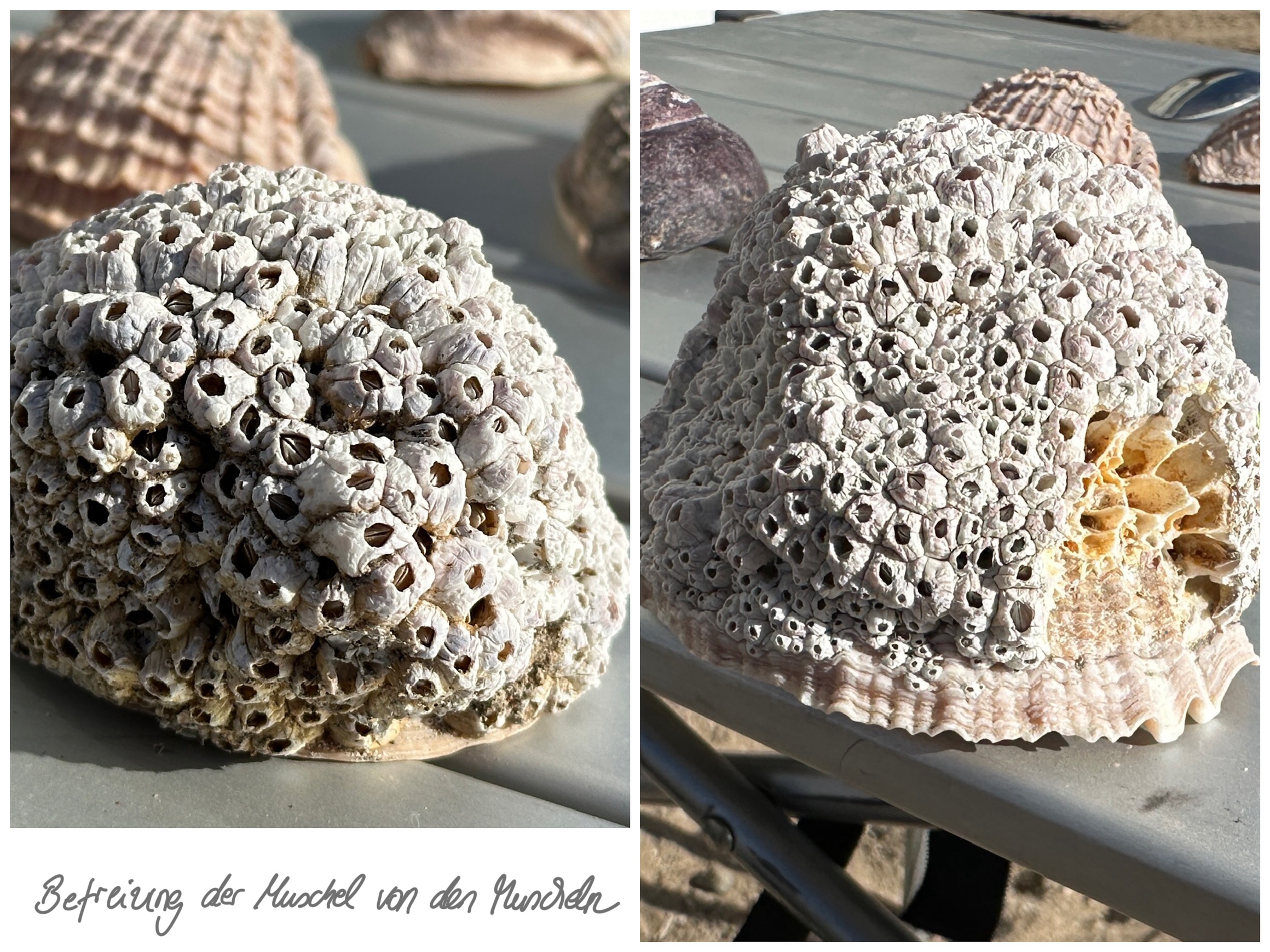 An der Ruta 10 finden wir unseren Stellplatz für die Nacht. Ein schöner Platz, aber leider liegt viel Müll in der Gegend, leider. Als wir an das Wasser gehen sagt Micha „Schau mal was hier liegt“. Muscheln, ganz viele große Muscheln. Herrlich!