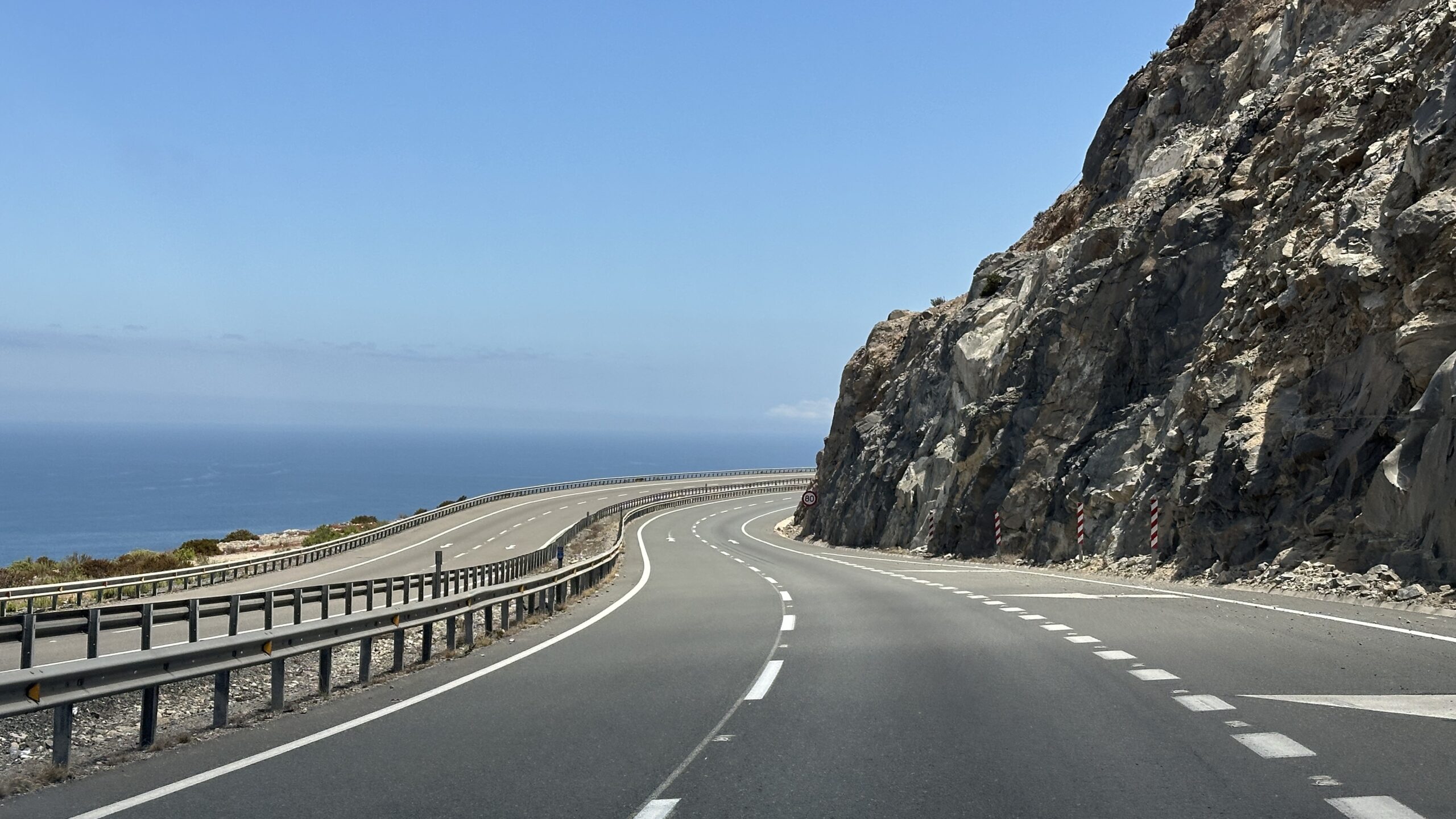 Wir fahren an der Playa entlang raus aus der Stadt. Die Straße ist gut, so dass Micha den Tempomat einstellen kann und wir gemütlich dahin rollern können. Der Wind hält sich in Grenzen, dafür regnet es. Richtiger Regen, der sogar die Windschutzscheibe von Bumba und die Seitenscheibe bei Micha reinigt. Nur bei mir ist es noch eine braune Schicht. Micha fährt bei einer Regenpause an den Rand und kommt mit dem Wassersack und einem Schwamm. „So geht das ja nicht, du kannst ja gar nichts mehr sehen“ und wäscht die Scheibe. Total lieb und ich brauche nicht mehr „Achtung, Scheibe geht auf“ sagen, damit ich ein Foto schießen kann.