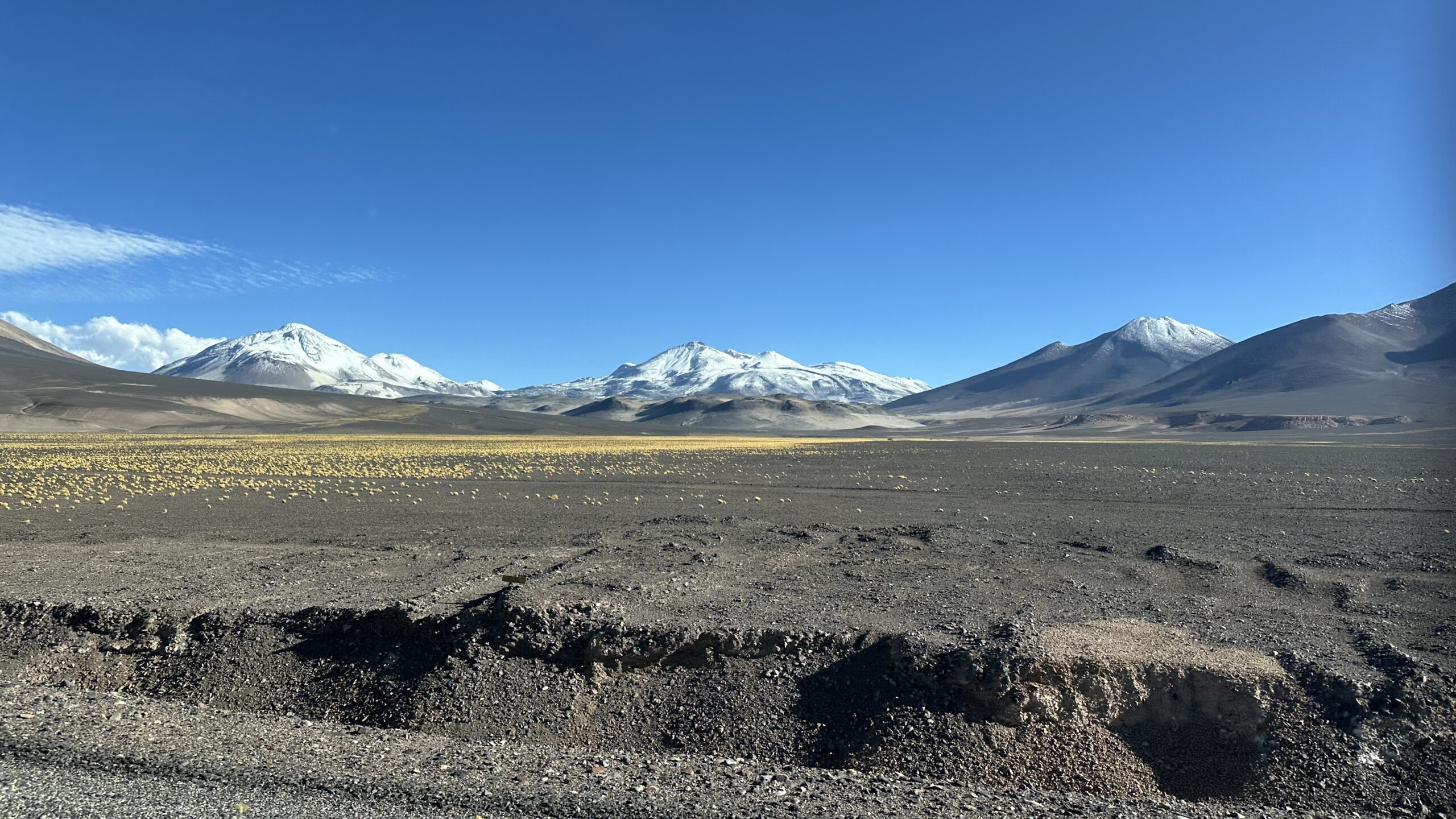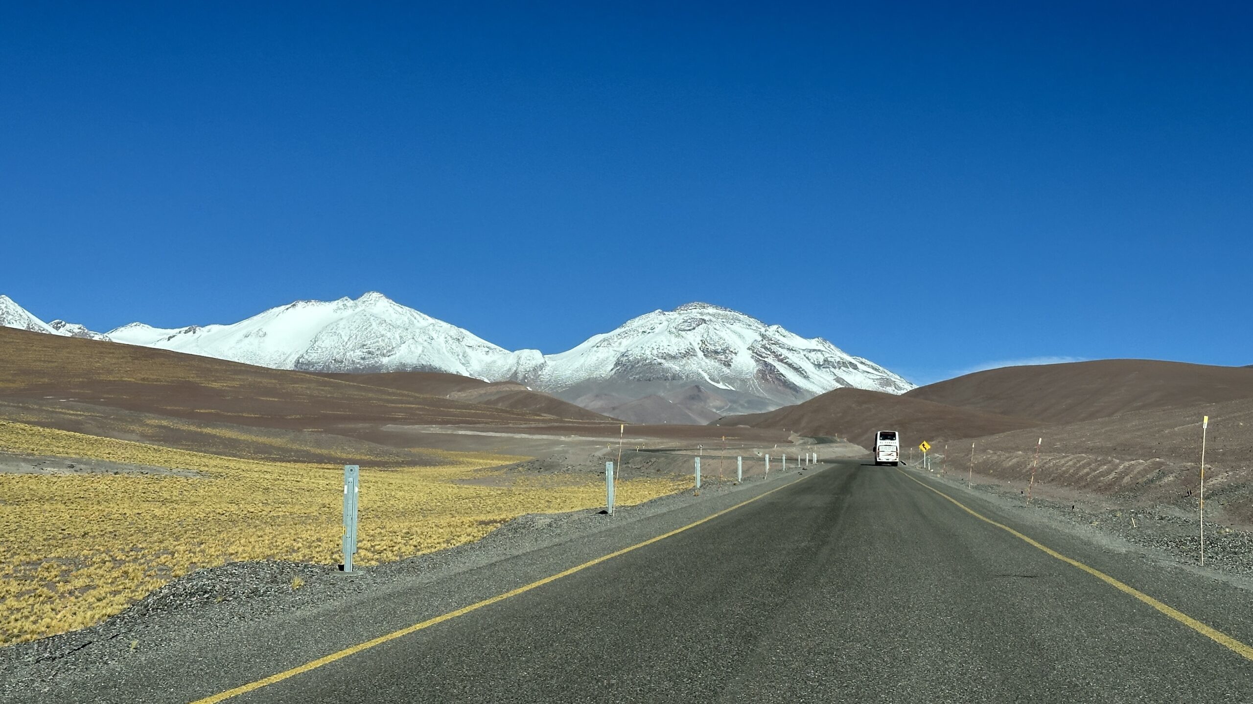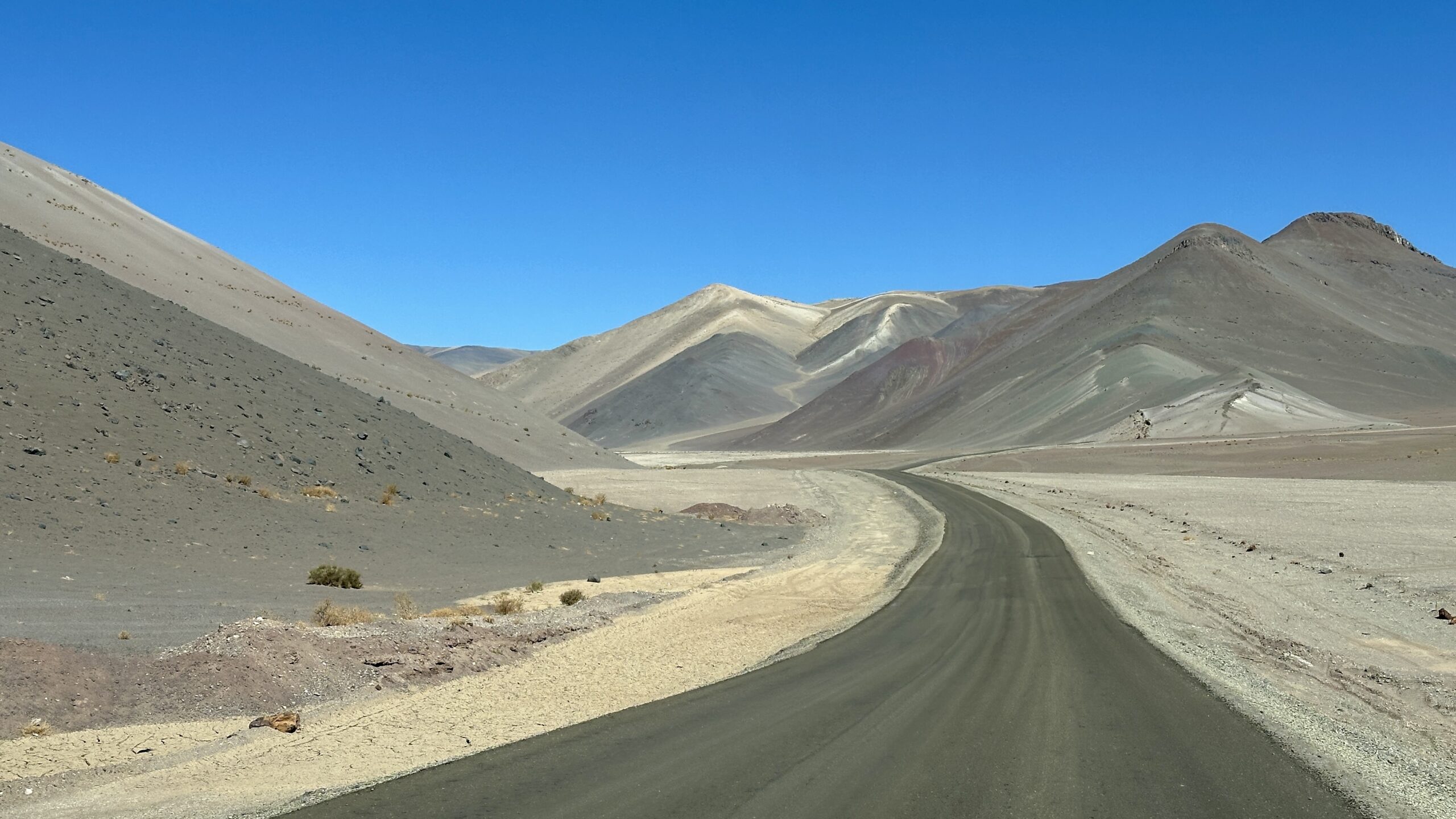 Lange gerade Straßen, gesäumt durch Vulkane, riesigen Bergen / Vulkanen am Horizont. So beeindruckend. Durch den strahlend blauen Himmel wirkt alles nochmal farbenprächtiger.