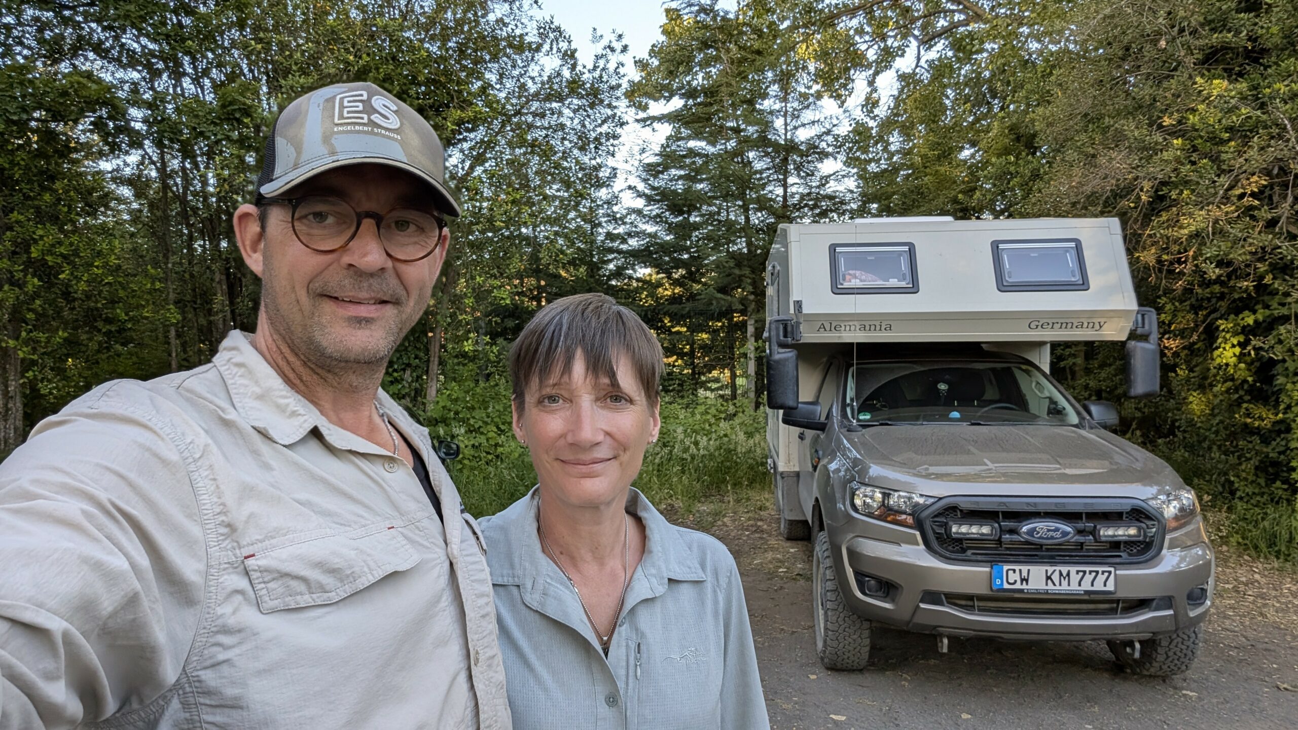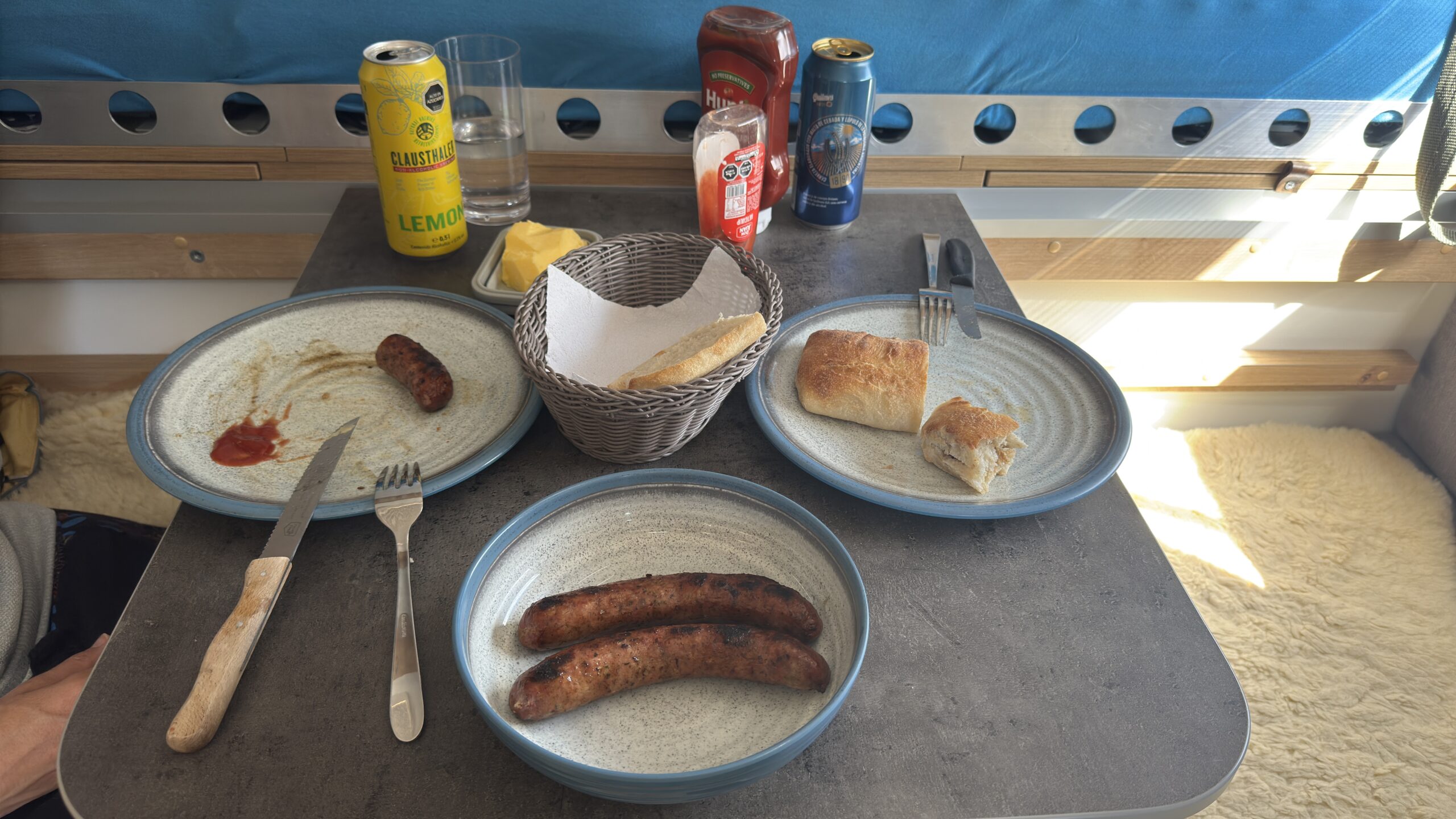 Es kläfft und kläfft und kläfft. Drei Hunde laufen hinter der uns liegenden Straße auf und ab und kläffen die Autos an. Vor den Autos, zwischen den Autos, überall wuseln diese Vierbeiner und kläffen. Da haben wir uns ja einen super Platz ausgesucht. Für eine Nacht wird es gehen und irgendwann müssen die Viecher auch mal Ruhe geben. Anstelle der Hunde hören wir dann ein aufdringliches Piepen. Woher kommt das? Wir hatten das vor drei Tagen schonmal gehört, allerdings hat das nach 3 x piepen aufgehört und wir konnten es nicht eruieren. Jacke und Schuhe an, raus aus dem Auto. Ist das der Airtec? Das er Bescheid gibt, dass die Batterie leer ist? Kann eigentlich nicht sein. Trotzdem prüfen. Micha liegt keine Minute später auf der Picknickdecke auf dem Boden. Nein, er ist es definitiv nicht. Ohr weiter in das Fach. Da, Micha hat es. Es ist der Warnmelder für Wasser. Er hatte völlig vergessen, das er ihn als Vorsichtsmaßnahme hingelegt hatte. Hier ist der Wassertank und laufen die Leitungen. Das Piepen kommt aus der Klappe, ganz deutlich. Zum Glück hat er das gemacht. Ein Verbindungsstück ist gebrochen und es läuft Wasser aus. Na toll. Bei gerade mal 8 Grad, feucht kalt mit ordentlichem Wind kann man sich nichts schöneres vorstellen, als in einem sehr beengten Bereich Wasserverbinder zu lösen und Verbindungen zu reparieren. Durchgefroren, aber erfolgreich, geht es nach 30 Minuten wieder rein. Heizung an und morgen noch schauen, ob wir hier irgendwo ein Verbindungsstück bekommen. Es ist unwahrscheinlich, da es aus dem Campingbereich kommt, versuchen kann man es aber.